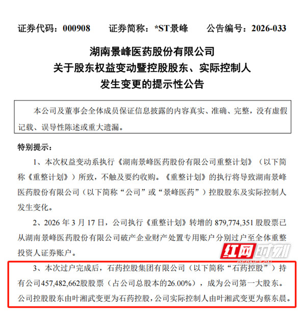 3月18日晚,*ST景峰发布公告称,公司控股股东、执行戒指东谈主发生变更,石药控股集团有限公司(以下简称“石药控股”)握有公司4.57亿股(占公司总股本的26%),成为公司第一大股东,公司控股股东由叶湘武变更为石药控股,公司执行戒指东谈主由叶湘武变更为蔡东晨。