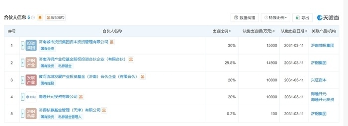 从该基金的结伴东说念主出资结构来看,多家济南腹地国资平台与国内头部投资机构参与本次出资,具体认缴情况为:济南城市投资集团成本投资处置有限公司(以下简称“济南城投成本”)认缴1.5亿元,济南济钢产业母基金股权投资结伴企业(有限结伴)(以下简称“济钢母基金”)认缴1.49亿元,黄河流域发展产业投资基金(济南)结伴企业(有限结伴)(以下简称“黄河母基金”)、海通开元投资有限公司(以下简称“海通开元投资”)各认缴1亿元,济钢私募基金处置(天津)有限公司(以下简称“济钢基金”)认缴100万元。