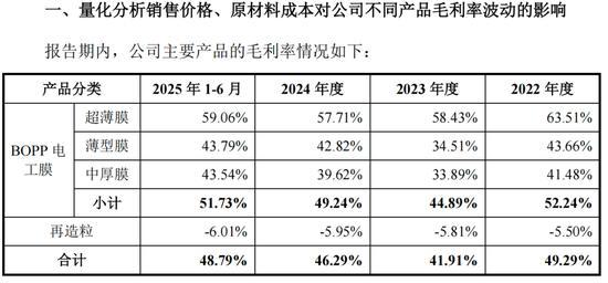 2022年-2024年,嘉德利超薄膜销售价钱执续走低,导致居品毛利率都集下滑,2025年1-6月单元销售价钱擢升带动毛利率高涨1.53个百分点,单元原材料成本镌汰带动毛利率高涨1.07个百分点。适度期末,嘉德利BOPP电工膜在手订单金额在手订单金额为6,148.23万元,毛利率为52.90%,在手订单金额和毛利率未出现下滑等不利情况。