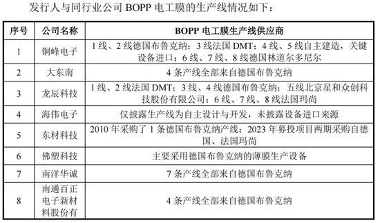 面前,国内概况出产BOPP电工膜出产线的制造商较少,如北京星和众创科技股份有限公司、北京机械工业自动化研究整个限公司等,但面前在薄型膜出产上存在一定不及。同业业公司中,龙辰科技2023年投产了1条北京星和众创科技股份有限公司的出产线,用于出产5-7μm基膜。