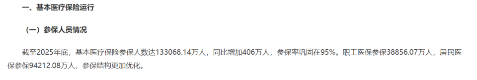先看参保情况,端正2025底,基本医保参保东谈主数约13.31亿东谈主,比上一年加多超400万东谈主,参保率巩固在95%。
