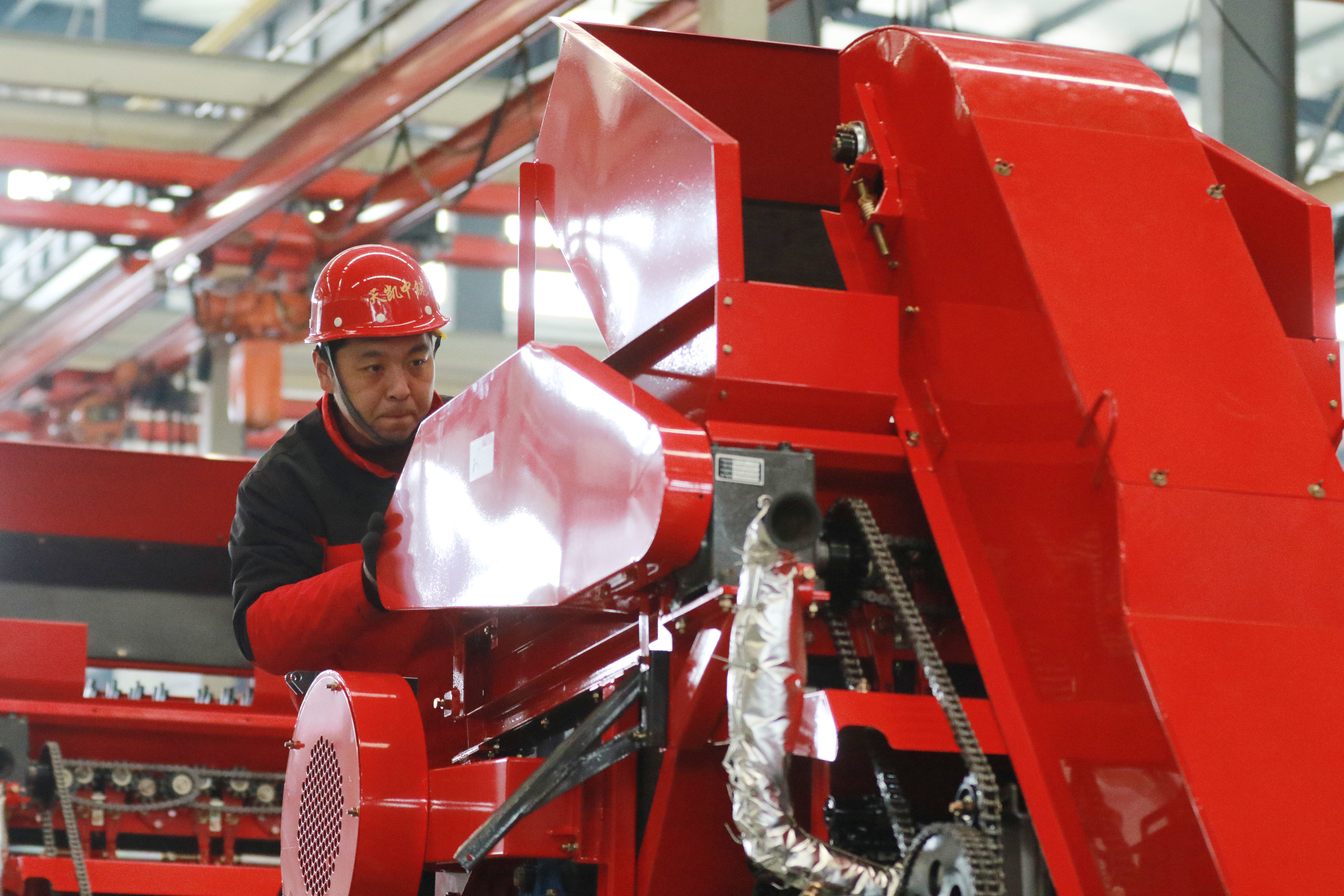 3月16日,在山东省高密市天凯中锐机械科技有限公司,开云体育(中国)官方网站工东说念主在分娩线上安装智能农机建造。