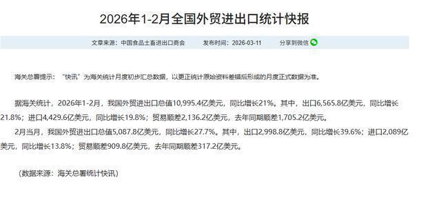 3月10号那天,我刷手机刷到海关总署的外贸数据,平直惊掉了下巴。2026年前两个月,中国买卖顺差干到2136亿好意思元,比阛阓预估的多了近400亿——这可不是极少目,极端于一个东南亚中等经济体全年的顺差规模。