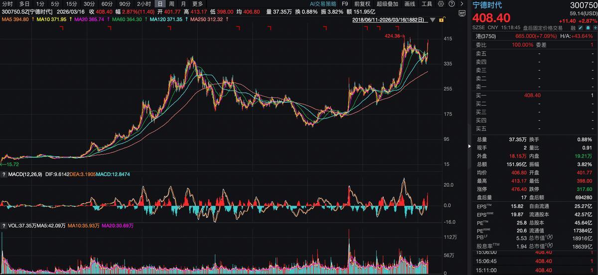 在走漏年报的同期,“宁王”也发布了2025年利润分派预案,拟以4,531,886,650股为基数,向全体股东每10股派发现款分红69.57元(含税),共计分红约315.32亿元。事实上,已往三年,宁德期间已累计分红近千亿元。截止3月16日收盘,宁德期间报收于408.4元/股,动态PE为25.8倍,总市值为1.89万亿。