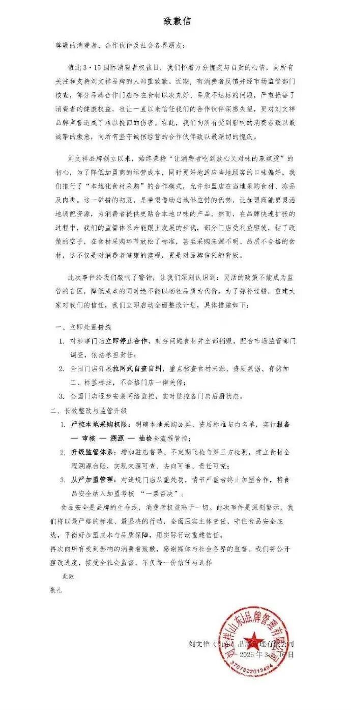 值此3.15外洋消耗者权柄日,咱们怀着万分羞愧与自责的激情,向所商酌注和复旧刘文祥品牌的东谈主注视致歉。近期,有消耗者响应并经市集监管部门核查,部分品牌结合门店存在食材以次充好、品性不达场所问题,严重挫伤了消耗者的健康权柄,也让一直以来信任咱们的结结伴伴深感失望,更对刘文祥品牌声誉形成了难以救助的伤害。在此,咱们向通盘受到影响的消耗者致以最古道的歉意,向通盘信守诚信规画的结结伴伴致以最深入的羞愧。