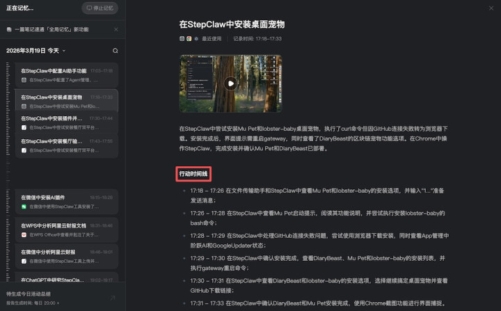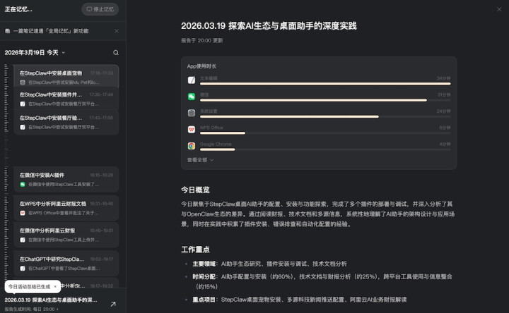 全局挂念则把这些过程纪录下来。系统每15分钟会自动生成挂念札记和对应的操作纪录,同期在一天截止后整理成齐备的日报。