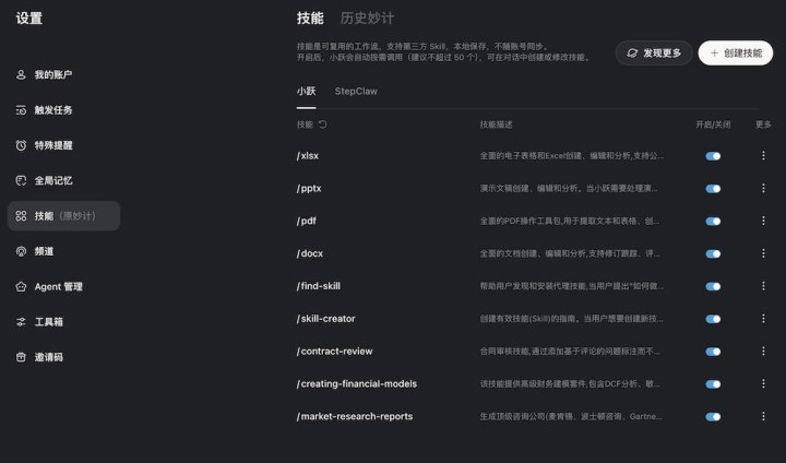 比如手段页里,用户不错径直稽查和启用各样Skill。