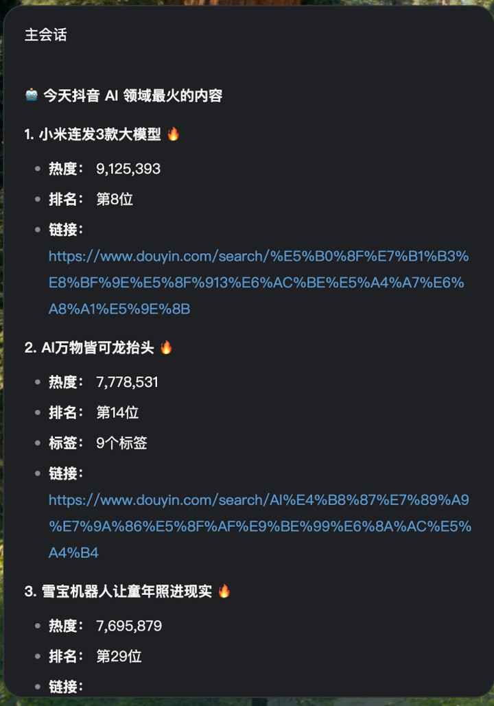 同期,我还装了一个抖音热榜插件,不错径直获取现时热榜,包括名次、热度和联接。如若有更具体的需求,比如只看AI操办内容,不错在对话里补充条目,它会按要求再行捏取。