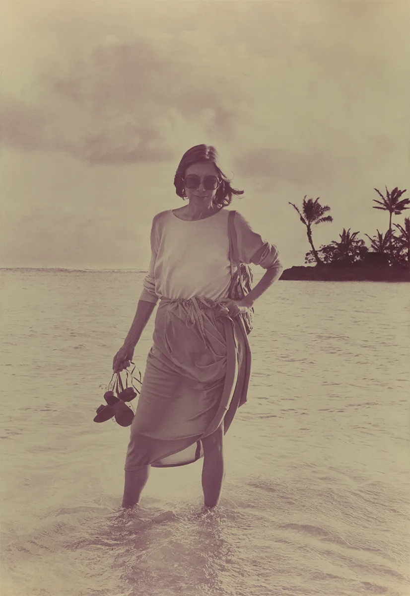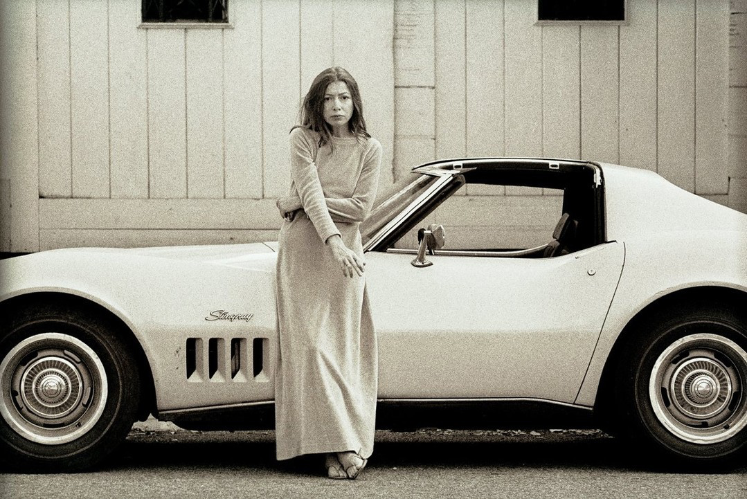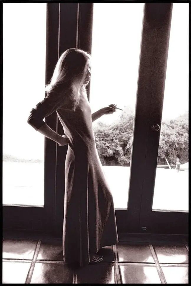 34岁那年,Joan Didion写完《向伯利恒跋涉》。影相师Julian Wasser为她拍下了一张相片:她穿着素色真诚长裙,踩着一对东谈主字拖,倚靠在新买的跑车旁。头发被风吹得有点乱,双腿交叉,豪情即兴得像是刚写脱稿出来透语气,却成了她经典的顷刻间。▼