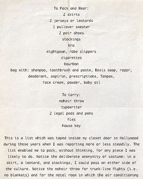 “两条裙子、两件开放衫或紧身衣、一件套头毛衣、两双鞋、丝袜、胸罩、寝衣、睡袍、拖鞋、烟草、波旁威士忌、装有洗漱用品的包。”▼