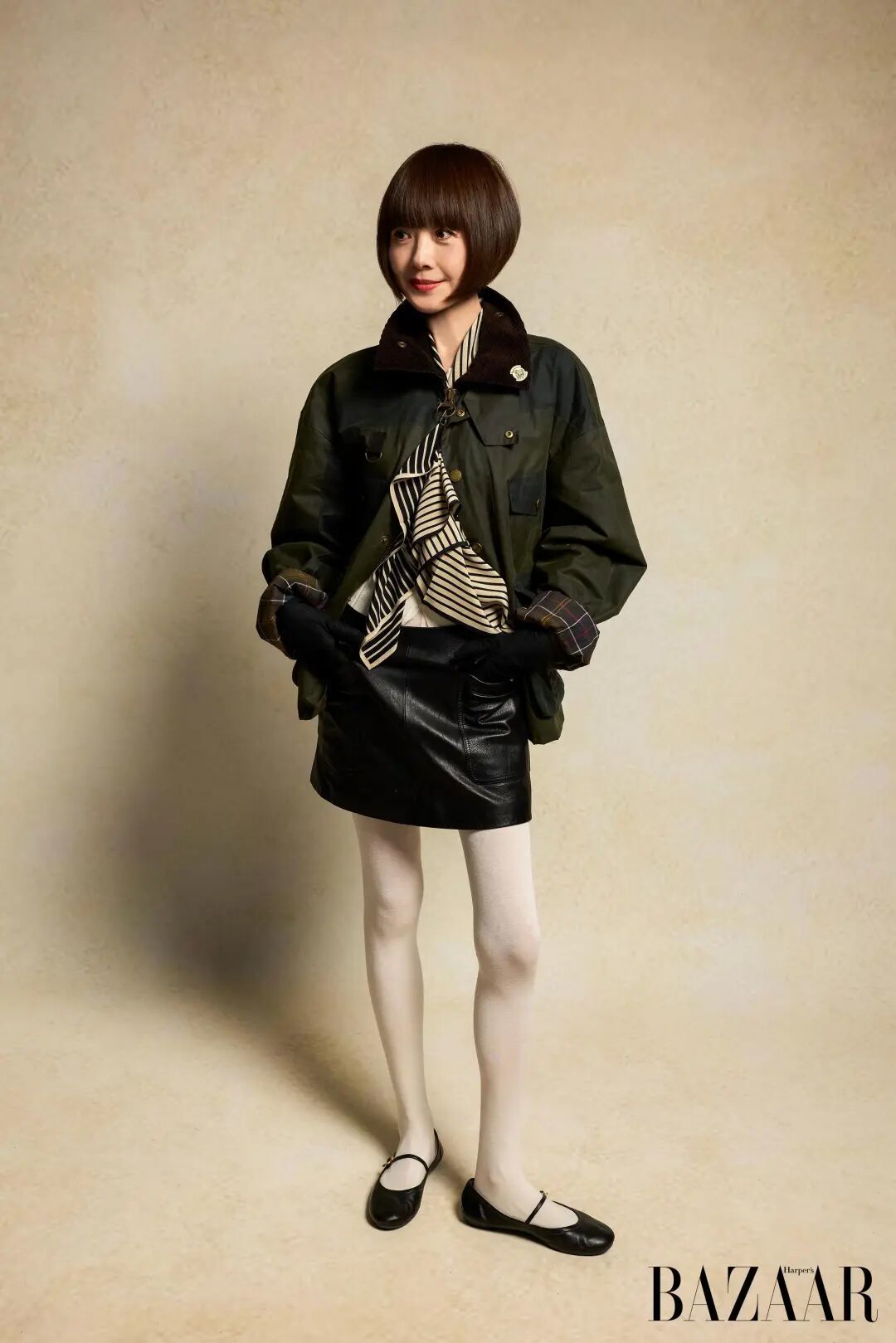 原本她复刻了一组Joan Didion(琼·狄迪恩)的经典造型——利落的Barbour工装夹克,搭配Frame皮裙、Calzedonia白色裤袜、Gianvito Rossi玛丽珍鞋,领口还系着一条条纹丝巾。▼