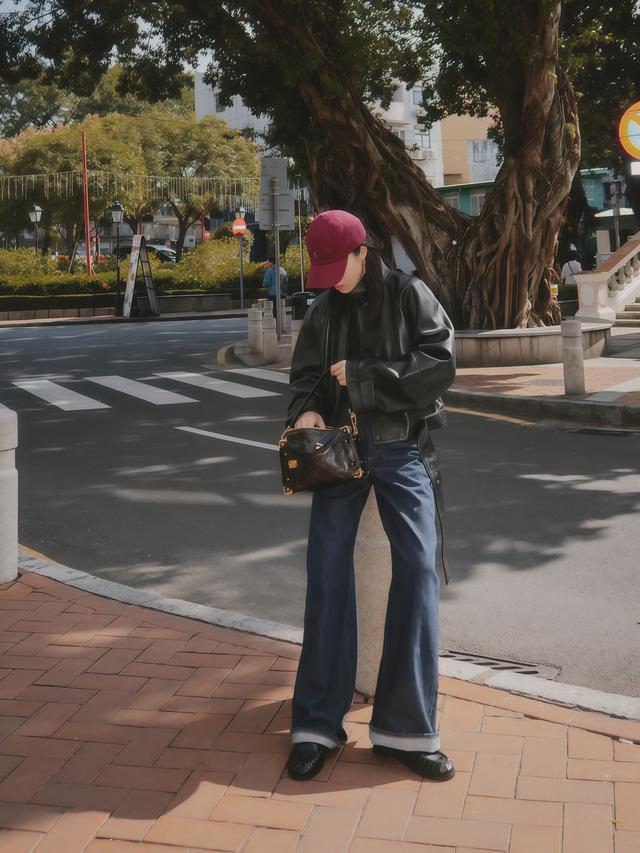 思要更酷少量,可以换成深蓝色牛仔阔腿裤,深蓝和玄色放在一齐,色彩更千里更有重量,整套穿搭偏酷偏帅,加一顶贝雷帽或报童帽进去,穿搭的细节丰富了好多,回头率会高不少。
