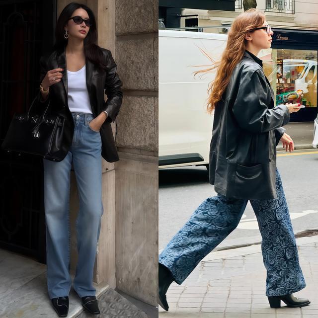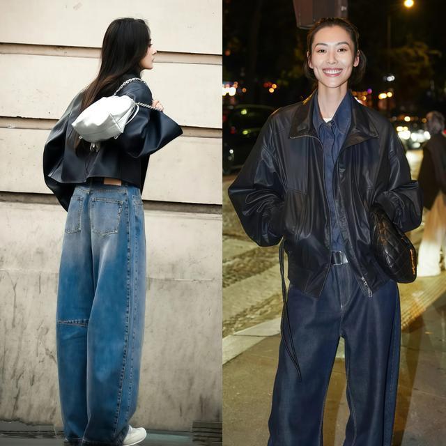 黑皮衣配浅蓝色牛仔阔腿裤,这是最经典也最坦然的一组配色,闭眼穿都不会出错,玄色的千里稳刚好收住牛仔蓝的舒服,两个面目放在一齐很认知,春天穿太合适了。
