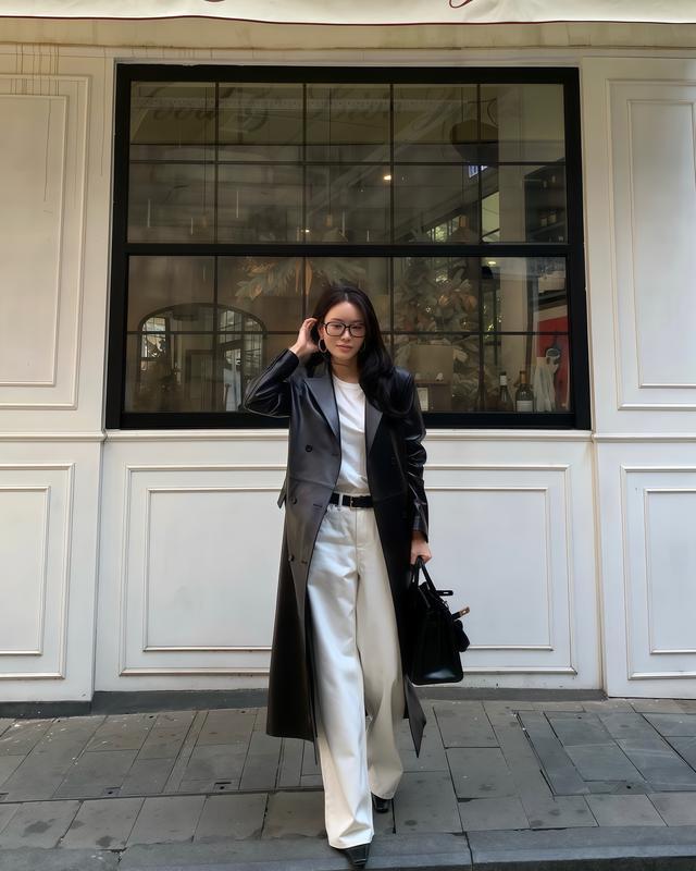 ✓ 长款皮衣配白裤,春天当风衣穿气场翻倍