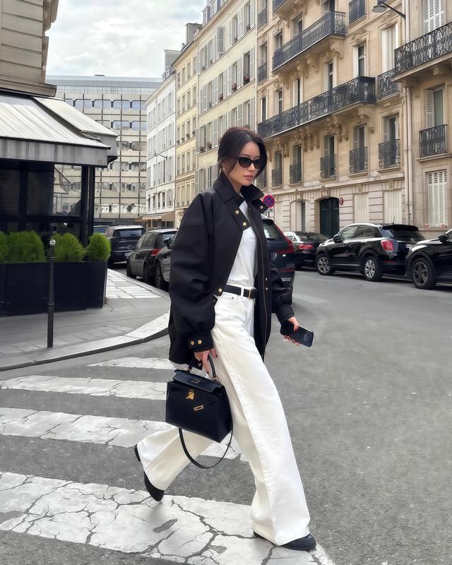 黑皮衣配白色阔腿裤是春天最认知的组合,内部打底一件白T恤,全身就两个面目,配色千万别进步三种,面目越浅易,穿出来越干净,白色阔腿裤推选选奶白色或米白色,纯白太亮穿不才半身容易刺眼,奶白配黑皮衣更柔软更安祥。
