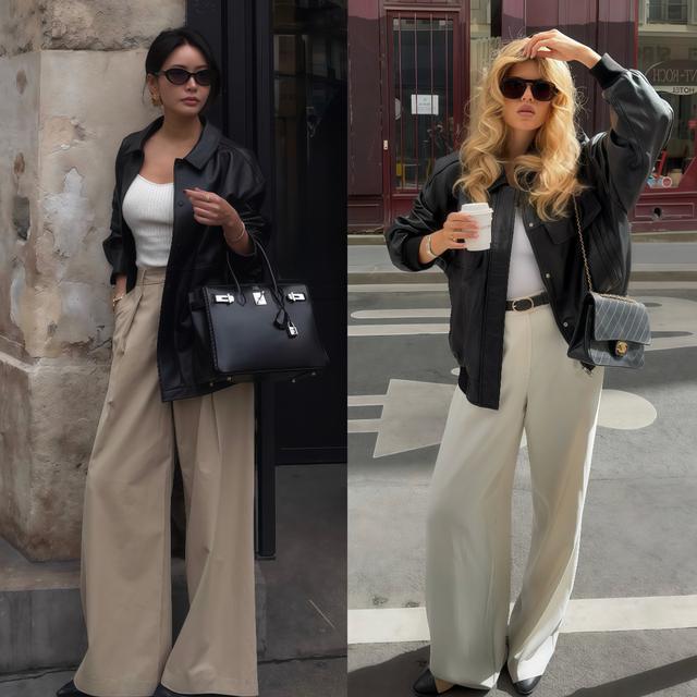 阔腿裤一定要选高腰,这是最基本的条件,高腰能把腰线往上提,搭配皮衣时把下摆塞进裤腰,或者天然盖住裤头位置,腿的比例会显得长好多,小个子穿高腰阔腿裤都能显高不少。