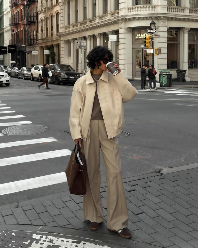奶油色系皮衣配奶油色阔腿裤也值得推选,全身一个色彩穿起来干净善良,春天穿淡色系很是应季,泛泛逛街周末出游都合适!