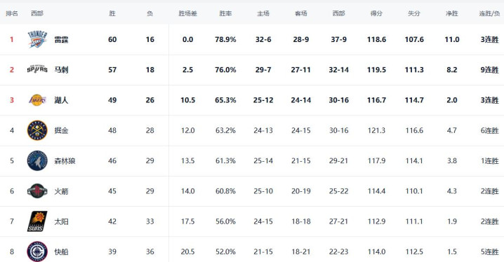 雷霆剩余6场比赛,敌手中有2次湖东说念主、1次掘金、1次太阳、1次快船,四支胜率在50%以上的球队。