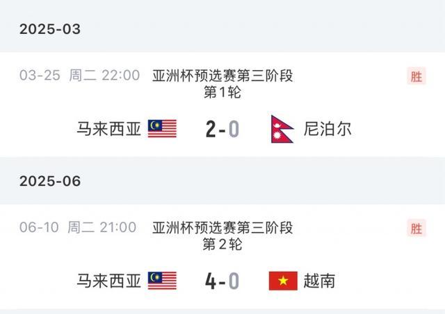 2-马来西亚在2025年3月25日的亚洲杯预选赛第三阶段第一轮对阵尼泊尔的比赛被判负,马来西亚这场比赛应被视为0-3落败。