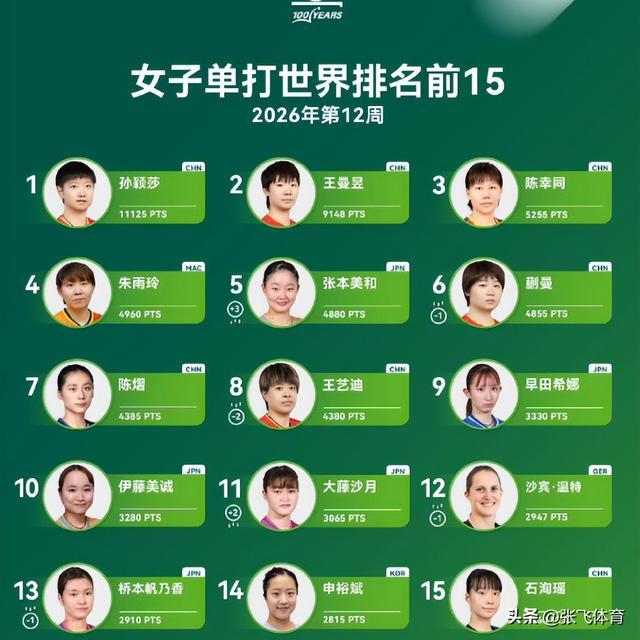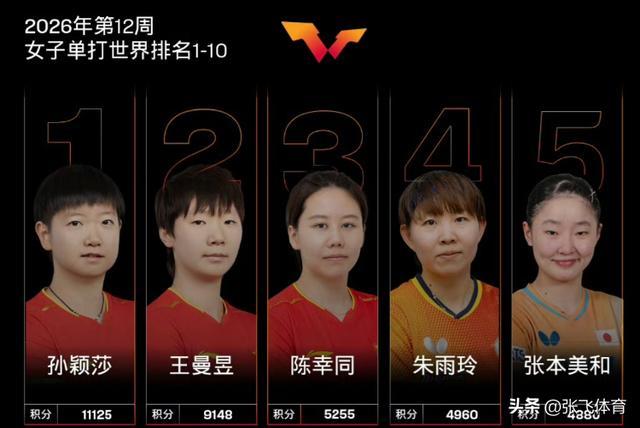 2026年3月中旬,海外乒联公布了新一期的天下女子单打排名。