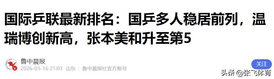 鲁中晨报——海外乒联最新排名:国乒多东谈主稳居前线,温瑞博立异高,张本好意思和升至第5