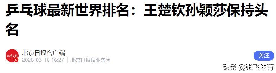 北京日报网——乒乓球最新天下排名:王楚钦孙颖莎保持头名