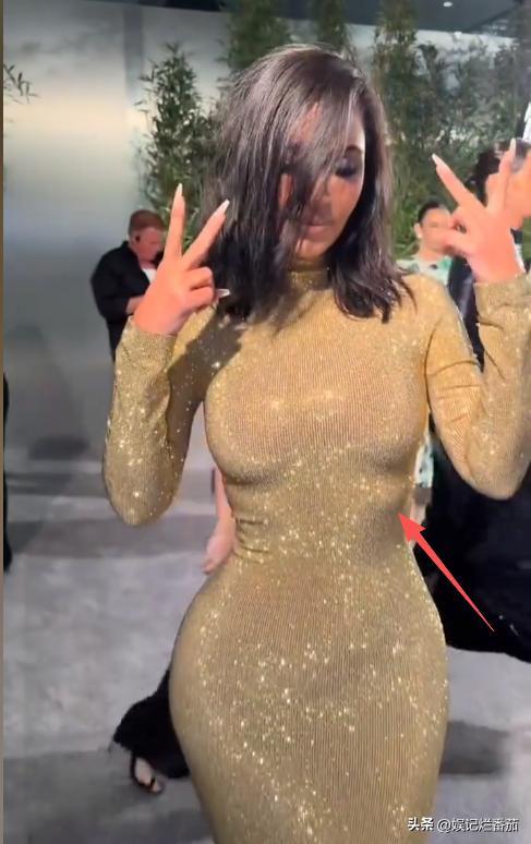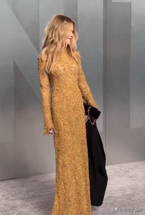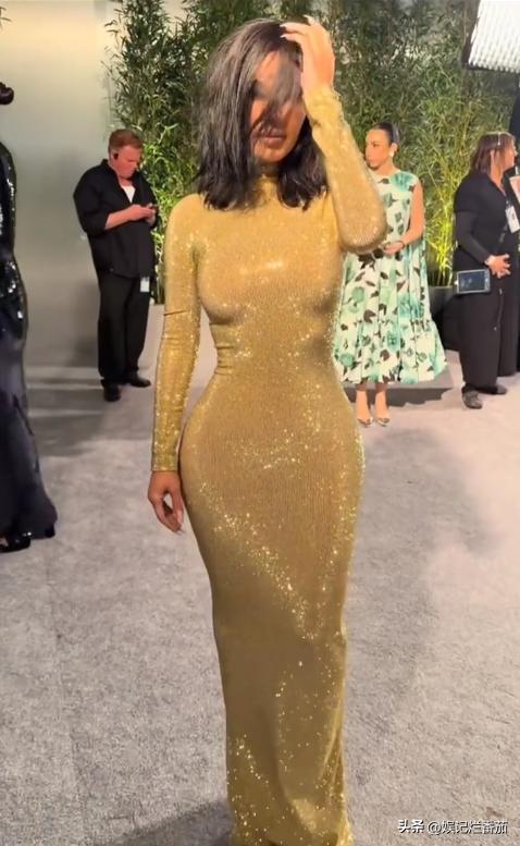 45岁的金·卡戴珊,亦然穿戴黄色裙子,但很修身和bulingbuling的。