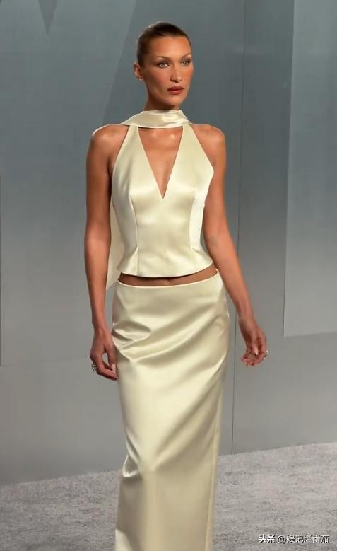 贝拉·哈迪德的服装,像是寝衣的材质,滑滑的有些上不了台面,她也不相宜白色。