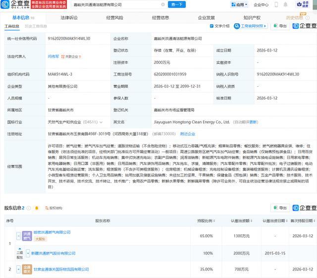 企查查APP透露,近日,嘉峪关洪通清洁动力有限公司缔造,kaiyun法定代表东谈主为闫伟军,注册成本为2000万元,决策边界包含:燃气决策;燃气汽车加气决策;聚积式快速充电站;站用加氢及储氢重要销售等。企查查股权穿透透露,该公司由洪通燃气(605169.SH)全资子公司哈密洪通燃气有限公司、甘肃金通雄关国外物流园有限公司共同合手股。