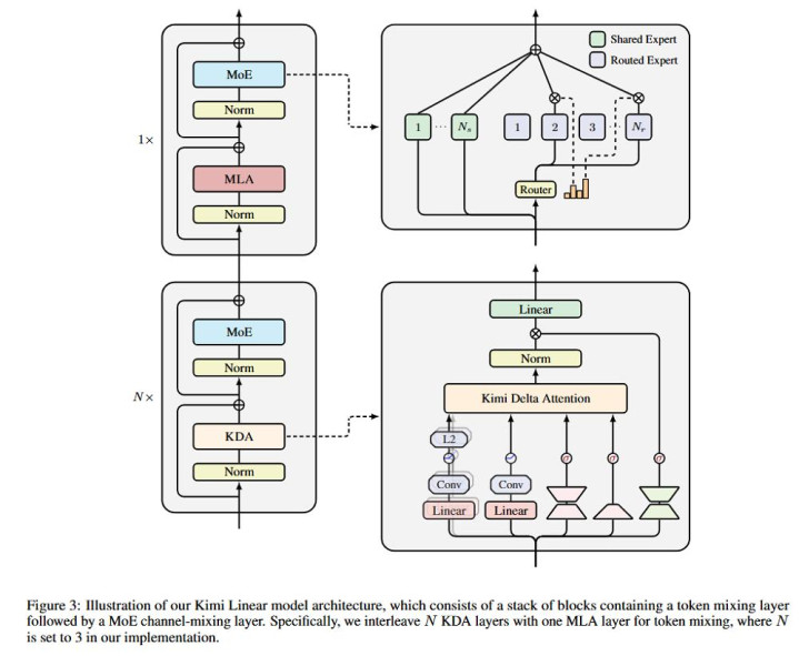客岁10月,月之暗面开源了羼杂线性防卫力架构Kimi Linear。其中枢是Kimi Delta Attention(KDA),这是一个新式的线性防卫力模块,通过细粒度策画校正了门控delta方法。这一线性架构接管1:3的羼杂比例,在减少内存占用的同期卓越了全防卫力模子的质地。