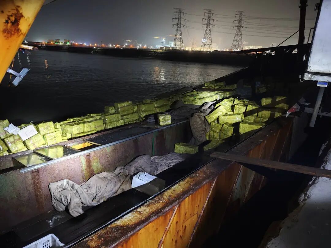 经现场盘点,船上装载箱装鲜嫩夏贻贝、雪蛤等海家具100余吨,均无法提供正当把柄,涉嫌私运。案件正在进一步侦办中。